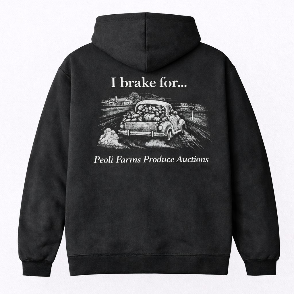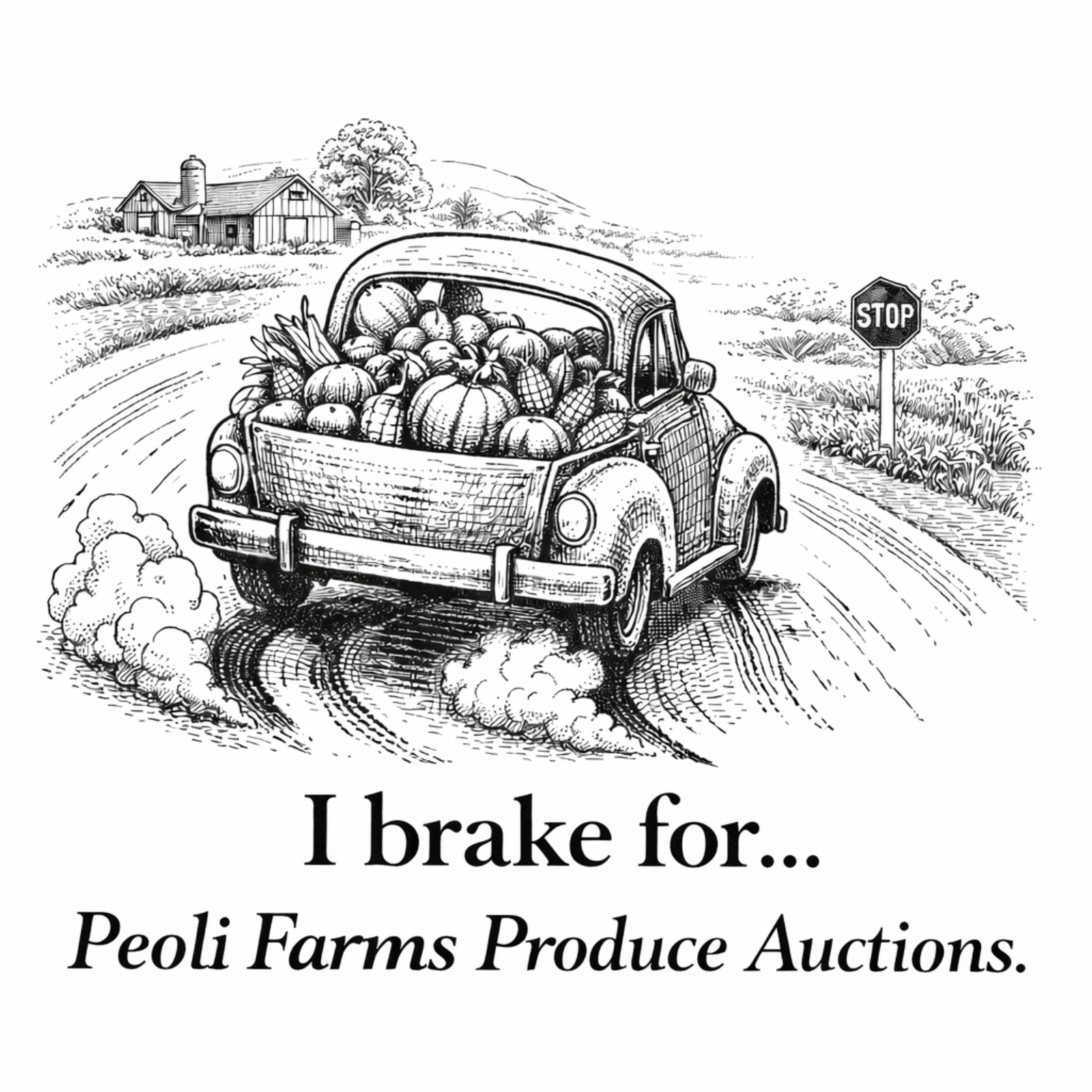 This design features a vintage-style illustration of a classic farm truck loaded down with fresh produce, kicking up dust on a country road—the kind of scene that just feels like home. Paired with the phrase “I brake for…”, it leaves just enough unsaid… because you already know what’s in the bed.